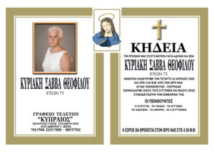 Έφυγε από τη ζωή και κηδεύεται την Τετάρτη 22 Απριλίου 2026 στις 5.45 μ.μ. από τον Ιερό Ναό Αγίας Παρασκευής Πατρίδας η Κυριακή Θεοφίλου σε ηλικία 71 ετών.