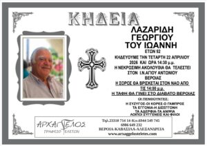 Έφυγε από την ζωή, σήμερα Τρίτη 21 Απριλίου 2026, σε ηλικία 92 ετών, ο Γεώργιος I. Λαζαρίδης, από τους παλαιότερους αυτοκινητιστές της Βέροιας με έντονη επαγγελματική δράση, ενώ υπήρξε και αρχηγός της Ένωσης Παλαιών Προσκόπων Βέροιας.