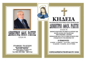 Έφυγε από τη ζωή και κηδεύεται την Πέμπτη 30 Απριλίου 2026 στις 2.00 μ.μ. από τον Ιερό Ναό Τιμίου Προδρόμου Καστανιάς ο Δημήτριος Αθαν. Ράπτης σε ηλικία 95 ετών.