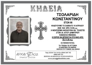 Έφυγε από τη ζωή και κηδεύεται το Σάββατο 18 Απριλίου 2026 στις 12.00 μ.μ. από τον Ιερό Ναό Αγίου Δημητρίου στα Καβάσιλα Ημαθίας ο Κωνσταντίνος Τσολαρίδης σε ηλικία 86 ετών.
