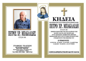 Έφυγε από τη ζωή και κηδεύεται την Τρίτη 28 Απριλίου 2026 στις 10.30 π.μ. από τον Ιερό Ναό Αγίου Αθανασίου (Κοιμητήρια) Βέροιας ο Πέτρος Χρ. Μπακαλίδης σε ηλικία 88 ετών.