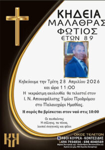 Έφυγε από τη ζωή και κηδεύτηκε σήμερα Τρίτη 28 Απριλίου 2026 στις 11.00 π.μ. από τον Ιερό Ναό Αποκεφάλισης Τιμίου Προδρόμου στο Παλαιοχώρι Ημαθίας ο Φώτιος Μαλάθρας σε ηλικία 89 ετών.