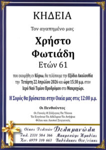 Έφυγε από τη ζωή και κηδεύτηκε σήμερα Τετάρτη 22 Απριλίου 2026 στις 3.30 μ.μ. από τον Ιερό Ναό Τιμίου Προδρόμου στο Μακροχώρι ο Χρήστος Φωτιάδης σε ηλικία 61 ετών.