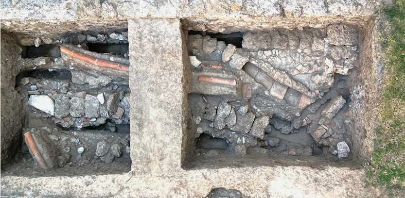 Τα παλαιότερα κατάλοιπα είναι μερικοί διάσπαρτοι τοίχοι ελληνιστικών χρόνων, που διασώθηκαν πολύ αποσπασματικά. Σε μεταγενέστερα, όμως, στρώματα ρωμαϊκών χρόνων, ο χώρος αποκτά λειτουργική συνοχή: αποκαλύφθηκαν εκτεταμένα δίκτυα αγωγών οργανωμένου υδροδοτικού συστήματος και συγκροτήματα ορθογώνιων χώρων οικονομικού χαρακτήρα, με πιθάρια και κεραμικό κλίβανο, που παραπέμπουν σε εμπορικές και εργαστηριακές δραστηριότητες.