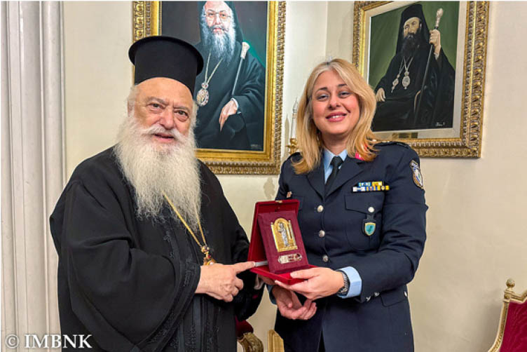 Ο κ. Παντελεήμων καλωσόρισε τη Γενική Περιφερειακή Αστυνομική Διευθύντρια στην Αποστολική Μητρόπολη Βεροίας και ευχήθηκε ο προστάτης και πολιούχος της Βεροίας, Όσιος Αντώνιος ο Νέος, καθώς και ο προστάτης της Ελληνικής Αστυνομίας, Άγιος Μεγαλομάρτυρας Αρτέμιος, να την ευλογούν και να την ενισχύουν στο δύσκολο έργο της.