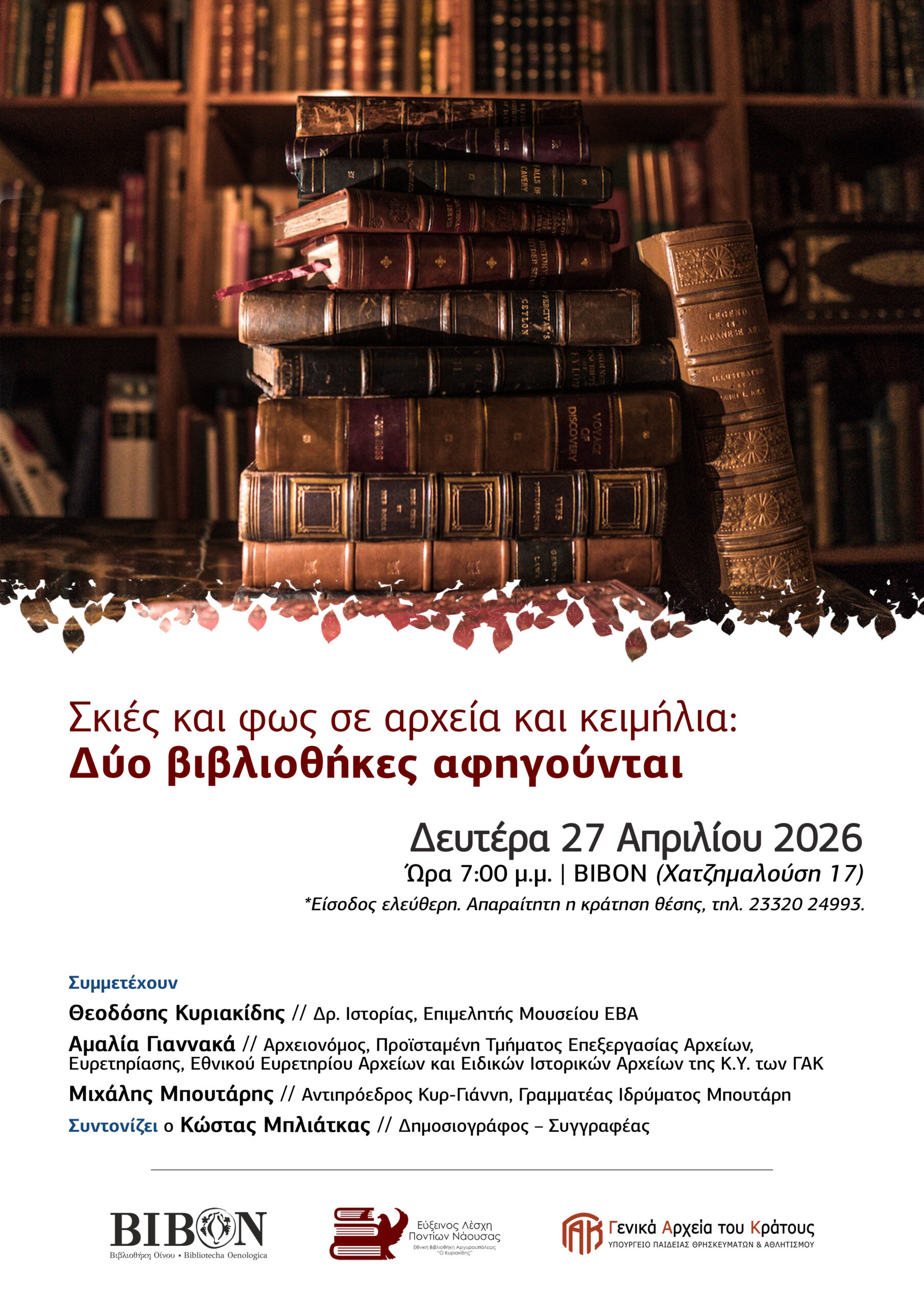 Τη Δευτέρα 27 Απριλίου 2026 και ώρα 19:00, θα πραγματοποιηθεί στη Βιβλιοθήκη Οίνου (ΒΙΒΟΝ) η εκδήλωση με τίτλο «Σκιές και φως σε αρχεία και κειμήλια: δύο βιβλιοθήκες αφηγούνται».
