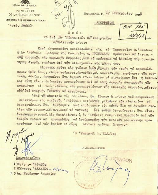 Επί τη ευκαιρία της δεξιώσεως ην έδωσεν η Δ/νσις του Ρουμανικού περιπτέρου της Διεθνούς Εκθέσεως κατ’ αυτάς, είχομεν την ευκαιρίαν να διαπιστώσωμεν ότι εκλήθησαν και παρέστησαν εις αυτήν όλα τα ενταύθα στελέχη των ρουμανιζόντων, παρά το γεγονός ότι ταύτα διατείνονται ότι είναι αντικομουνισταί. Δεν αποκλείεται η εν Αθήναις Ρουμανική Πρεσβεία δια των επαφών τούτων να προσπαθήση να αναζωπυρώση την παλαιών ρουμανικήν προπαγάνδαν δια την οποία θα εύρη πάντοτε πρόθυμα όργανα».