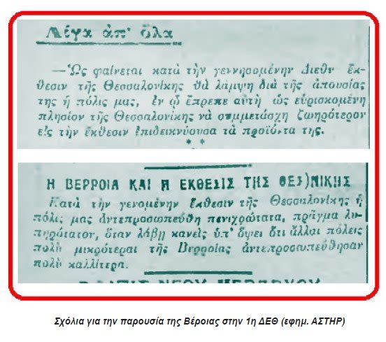Έτσι, μετά το τέλος της πρώτης Διεθνούς Έκθεσης της Θεσσαλονίκης και πάλι η εφημερίδα της Βέροιας «ΑΣΤΗΡ», στο φύλλο της 17ης Οκτωβρίου 1926, ξανά σε πρωτοσέλιδο σχόλιο σημείωνε: «Κατά την γενομένηνέκθεσιν της Θεσσαλονίκης η πόλις μας αντιπροσωπεύθη πενιχρώτατα, πράγμα λυπηρότατον, όταν λάβει κανείς υπ’ όψει ότι άλλαι πόλεις πολύ μικρότεραι της Βέροιας αντιπροσωπεύθησαν πολύ καλύτερα».