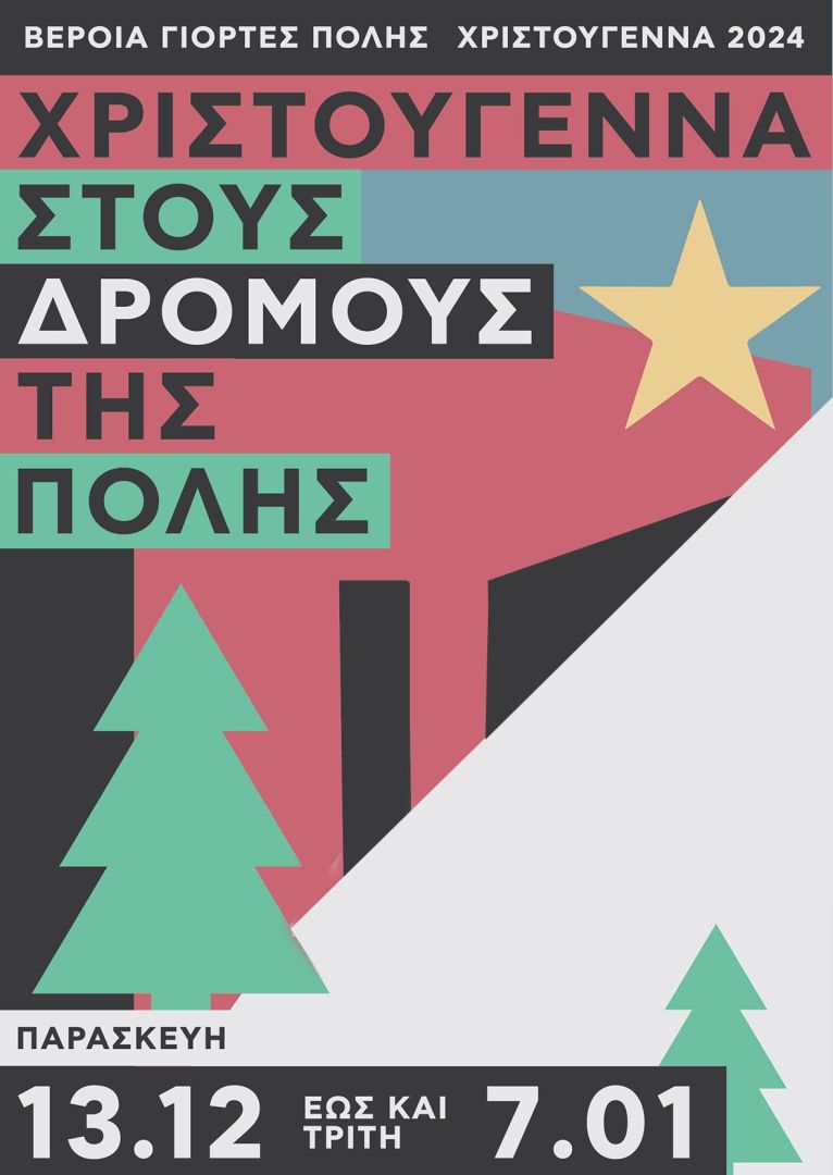 Στην στολισμένη, Χριστουγεννιάτικη Πλατεία: Lazer-προτζέκτορες με θέμα το χιόνι, τρεχούμενες φωτιζόμενες γιρλάντες, ξύλινα σπιτάκια, φάτνη, ξωτικά, ελαφάκια και το σπίτι του Αι Βασίλη με το ταχυδρομείο,  show με μάγο, εργαστήρια καραμέλας, προβολές  ταινίας μέσω εικονικής πραγματικότητας, ‘’Πάρτι Φαμίλια’’, παιχνιδο – συναυλία για όλη την οικογένεια με τους «Burger Project», face painting, με τη συμμετοχή Παιδικών Σταθμών και ΚΔΑΠ, Σχολών Χορού, του Συλλόγου  Ζαχαροπλαστών Βέροιας, Πολιτιστικών Συλλόγων, Φιλαρμονικής της ΚΕΠΑ.