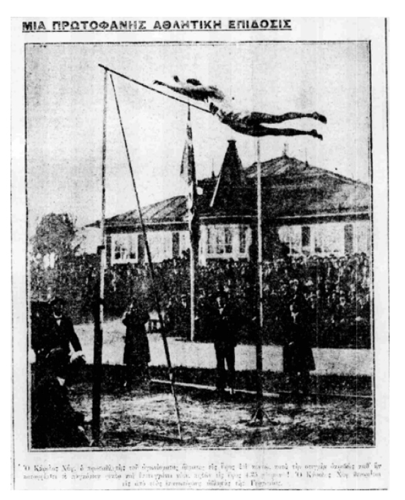 «Ο Κάρολος Χοφ, ο πρωταθλητής του αγωνίσματος άλματος επί κοντώ, κατά την στιγμήν ακριβώς καθ’ ην καταρρίπτει το παγκόσμιον ρεκόρ και επιτυγχάνει νέον, πηδών εις ύψος 4.25 μέτρων! Ο Κάρολος Χοφ θεωρείται εις από τους ικανωτέρους αθλητάς της Γερμανίας*»