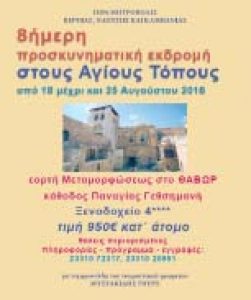 Η Ιερά Μητρόπολη διοργανώνει 8ήμερη προσκυνηματική εκδρομή στους Αγίους Τόπους από 18 μέχρι και 25 Αυγούστου.