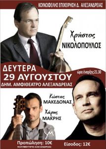 Συναυλία με τους Χρήστο Νικολόπουλο, Κώστα Μακεδόνα και Χάρη Μακρή θα πραγματοποιηθεί στο δημοτικό αμφιθέατρο της Αλεξάνδρειας τη Δευτέρα