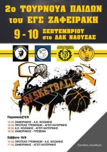 Το 2ο τουρνουά μπάσκετ παίδων του Ζαφειράκη θα πραγματοποιηθεί 9-10 Σεπτεμβρίου στο κλειστό της Νάουσας. Συμμετέχουν εκτός από τον διοργανωτ