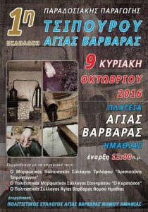 Ο Πολιτιστικός Σύλλογος Αγίας Βαρβάρας Ημαθίας διοργανώνει την 1η εκδήλωση παραγωγής παραδοσιακού τσίπουρου Αγίας Βαρβάρας την Κυριακή 9