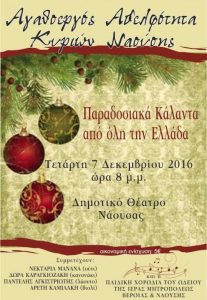 Η Αγαθοεργός Αδελφότητα Κυριών Ναούσης ενόψει των Χριστουγέννων πραγματοποιεί μουσική εκδήλωση με τίτλο «ΠΑΡΑΔΟΣΙΑΚΑ ΚΑΛΑΝΤΑ ΑΠΟ ΤΗΝ ΕΛΛ
