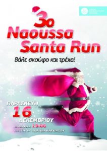 Τον 3ο αγώνα «Naoussa Santa Run» διοργανώνει για τρίτη συνεχή χρονιά ο δήμος Νάουσας, απόστασης περίπου 1.700 μ., που θα διεξαχθεί την Παρασκευή 16 Δεκε?