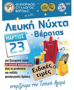 H Λευκή Νύχτα «πέφτει» από το απόγευμα σήμερα στην Αγορά της Βέροιας, με πρωτοβουλία του Εμπορικού Συλλόγου σε συνδιοργάνωση με τον Δήμο ?