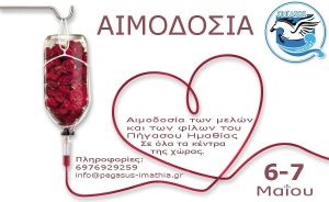 Το Σαββατοκύριακο 7-8 Μαΐου ο Πήγασος Ημαθίας διοργανώνει την 6η Αιμοδοσία για την τράπεζα αίματος του συλλόγου. Όλα τα μέλη και οι φίλοι του