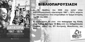 Η παρουσίαση του βιβλίου “Δικτατορία 1967 – 1974, κείμενα και ντοκουμέντα”, που επιμελήθηκε το Τμήμα Ιστορίας της Κ.Ε. του ΚΚΕ, θα πραγματοποιηθεί