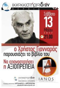 Το νέο βιβλίο του Χρήστου Γιανναρά «Να επαναστατήσει η αξιοπρέπεια» (Εκδόσεις ΙΑΝΟS) παρουσιάζει το Σάββατο στις 9μμ το Εκκοκκιστήριο Ιδεών