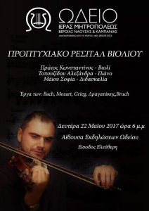 Προπτυχιακό Ρεσιτάλ Βιολιού του σπουδαστή Κωνσταντίνου Πρώιου, τάξη βιολιού της κ. Σοφίας Μάιου, θα πραγματοποιηθεί τη Δευτέρα 22 Μαΐου στι?