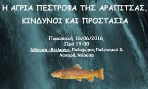 Ενημερωτική ημερίδα με θέμα «Η άγρια πέστροφα της Αράπιτσας, Κίνδυνοι και Προστασία» διοργανώνει το τμήμα Αλιείας της Π.Ε. Ημαθίας με τον Υ?