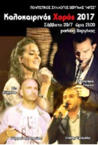 Ο Εκπολιτιστικός και Μορφωτικός Σύλλογος Βεργίνας «ΑΙΓΕΣ» διοργανώνει καλοκαιρινό χορό το Σάββατο 29 Ιουλίου στις 9.00μμ. στον χώρο του ανοι?