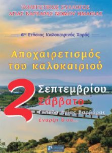 Ο Πολιτιστικός Σύλλογος Αγίας Βαρβάρας διοργανώνει τον 6ο ετήσιο καλοκαιρινό χορό « Αποχαιρετισμός του καλοκαιριού» , στις 2 Σεπτεμβρίου