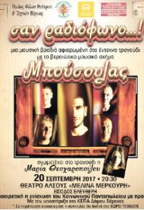 «Στις 20 Σεπτεμβρίου, στο Θέατρο Άλσους «ΜΕΛΙΝΑ ΜΕΡΚΟΥΡΗ» θα πραγματοποιηθεί συναυλία σύγχρονου έντεχνου τραγουδιού με το Βεροιώτικο Μουσ?