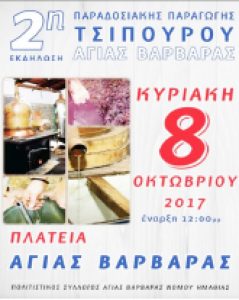 Ο Πολιτιστικός Σύλλογος Αγίας Βαρβάρας διοργανώνει την 2η Εκδήλωση Παραδοσιακής Παραγωγής Τσίπουρο Αγίας Βαρβάρας την Κυριακή 8 Οκτωβρίου