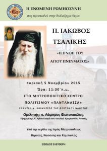 Διάλεξη με θέμα: Π. ΙΑΚΩΒΟΣ ΤΣΑΛΙΚΗΣ «Η ΠΝΟΗ ΤΟΥ ΑΓΙΟΥ ΠΝΕΥΜΑΤΟΣ» διοργανώνει την Κυριακή στις 11:30πμ στην αίθουσα εκδηλώσεων του Μητροπολιτ