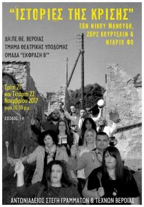 Την παράσταση «Ιστορίες της κρίσης» των Νίκου Μανούδη, Zώρζ Κουρτελίν και Ντάριο Φο παρουσιάζει η Θεατρική Σκηνή Ενηλίκων «ΕΚΦΡΑΣΗ Β», του ?