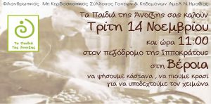 Τον χειμώνα θα υποδεχτούν με μια ζεστή και γευστική εκδήλωση σήμερα Τρίτη τα Παιδιά της Άνοιξης στον πεζόδρομο της Ιπποκράτους. Από τις 11 τ?