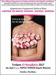 Ενημερωτική εκδήλως για τον καρκίνο του μαστού, την πρόληψη, διάγνωση και θεραπεία του, πραγματοποιείται αύριο Τετάρτη στο Χώρο Τεχνών Βέρ?