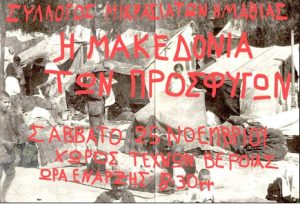 Ο Σύλλογος Μικρασιατών Ημαθίας , το Σάββατο 25 Νοεμβρίου παρουσιάζει τη θεατρικομουσικοχορευτική παράσταση «Η ΜΑΚΕΔΟΝΙΑ ΤΩΝ ΠΡΟΣΦΥΓΩΝ».