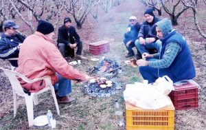 Εικόνα καθημερινότητας στον κάμπο της Ημαθίας, στα μαγαζιά… χωρίς σκεπή. Κλάδεμα στο χωράφι με μηδενικές θερμοκρασίες, με την ώρα του καφέ.