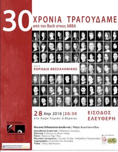 «30 ΧΡΟΝΙΑ ΤΡΑΓΟΥΔΑΜΕ από τον Bach στους ABBA» |με την Μικτή Χορωδία Θεσσαλονίκης | ΧΩΡΟΣ ΤΕΧΝΩΝ ΔΗΜΟΥ ΒΕΡΟΙΑΣ Σάββατο 28 Απριλίου 2018 | Ώρα 20:30..