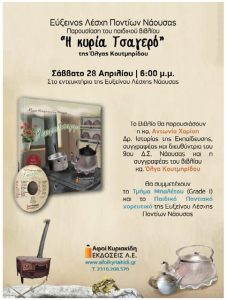 Στις 28 Απριλίου και ώρα 6 το απόγευμα στην Εύξεινο Λέσχη Ποντίων και την Βιβλιοθήκη Νάουσας θα φιλοξενηθεί η συγγραφέας Κυρία Όλγα…