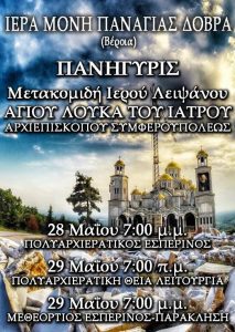 Πανηγυρίζει η Ιερά Μονή Παναγίας Δοβρά στη Βέροια την Μετακομιδή των Ιερών Λειψάνων του Αγίου Λουκά του ιατρού Αρχιεπισκόπου…