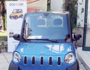 Ένα μικρό ηλεκτρικό αυτοκίνητο, το ecocar, το μικρότερο μικρό ηλεκτρικό αυτοκίνητο της ελληνικής αγοράς, παρουσιάζεται έξω από το Χώρο Τεχνών,