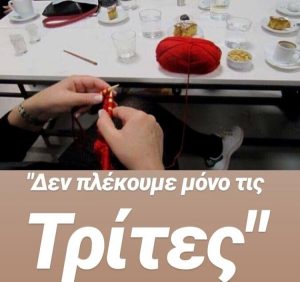 Την Τρίτη 19 ΙουνίουΟι συναντήσεις της πλεκτικής ομάδας «Πλέξη – girls» γίνονται κάθε Τρίτη, στις 8.30 το βράδυ αλλά το πλέξιμο δεν περιορίζεται..