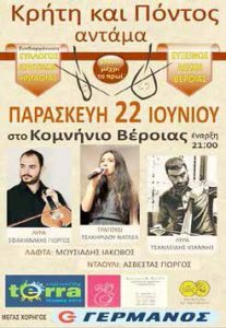 Ο Σύλλογος Κρητικών Ν. Ημαθίας και η Εύξεινος Λέσχη Βέροιας σας προσκαλούν την Παρασκευή 22 Ιουνίου 2018 σε ένα Κρητικοποντιακό γλέντι στο…