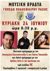 Η μουσική βραδιά στη Ράχη, που αναβλήθηκε λόγω καιρικών συνθηκών, θα πραγματοποιηθεί την Κυριακή 24 Ιουνίου και ώρα 20:30 στο αθλητικό κέντρο…