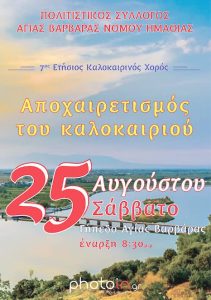 Ο πρόεδρος και τα μέλη του Δ.Σ. του Πολιτιστικού Συλλόγου Αγ. Βαρβάρας Δήμου Βέροιας, διοργανώνει το Σάββατο 25 Αυγούστου 2018, τον 7ο Ετήσιο…