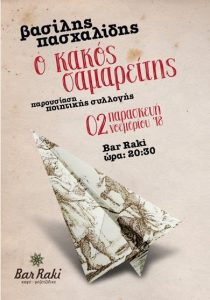 Την Παρασκευή 2 ΝοεμβρίουΤην ποιητική του συλλογή «Ο Κακός Σαμαρείτης» παρουσιάζει την Παρασκευή 2 Νοεμβρίου στις 8.30μμ στο BAR RAKI στη Νάουσα.
