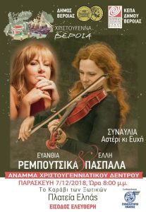 – Την Παρασκευή 7 Δεκεμβρίου στις 7.00μ.μ. στην Πλατεία Εληάς- Συναυλία της Ευανθίας Ρεμπούτσικακαι της Έλλης ΠασπαλάΧριστούγεννα