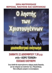 Τό Σάββατο 22 Δεκεμβρίου καί ὥρα 7:30 μ.μ. στό Χῶρο Τεχνῶν τοῦ Δήμου Βεροίας τό Θεατρικό Ἐργαστήρι τῆς Ἱερᾶς Μητροπόλεως μας θά…