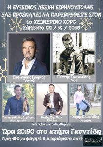 Το Δ/Σ της Ευξείνου Λέσχης Ειρηνούπολης, με χαρά σας προσκαλεί στον 1ο χειμερινό χορό που διοργανώνει στο ΚΤΗΜΑ-ΓΚΑΝΤΙΔΗ, το Σάββατο 22…