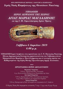 Ο Ιερός Ναός Παναγίας έχει την μεγάλη ευλογία να υποδεχθεί και να φιλοξενήσει το άφθαρτο και θαυματουργό χέρι της Αγίας Μαρίας Μαγδαληνής..