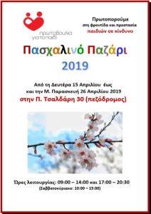 Η Πρωτοβουλία για το Παιδί ανακοινώνει τη διεξαγωγή του τακτικού Πασχαλιάτικου Bazaar της, που θα γίνει στο επί της οδού Π. Τσαλδάρη 30…